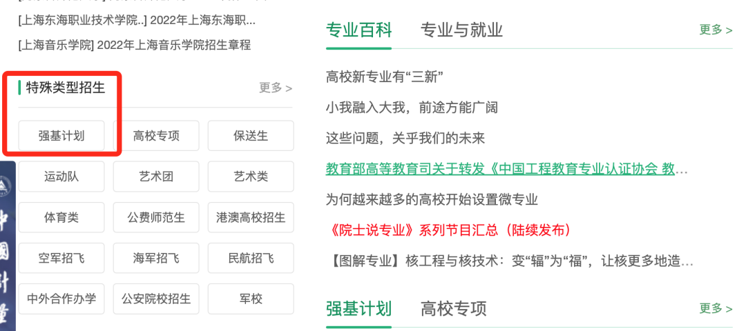 2.在首页找到“特殊类型招生”菜单,选择“强基计划”,点击进入。